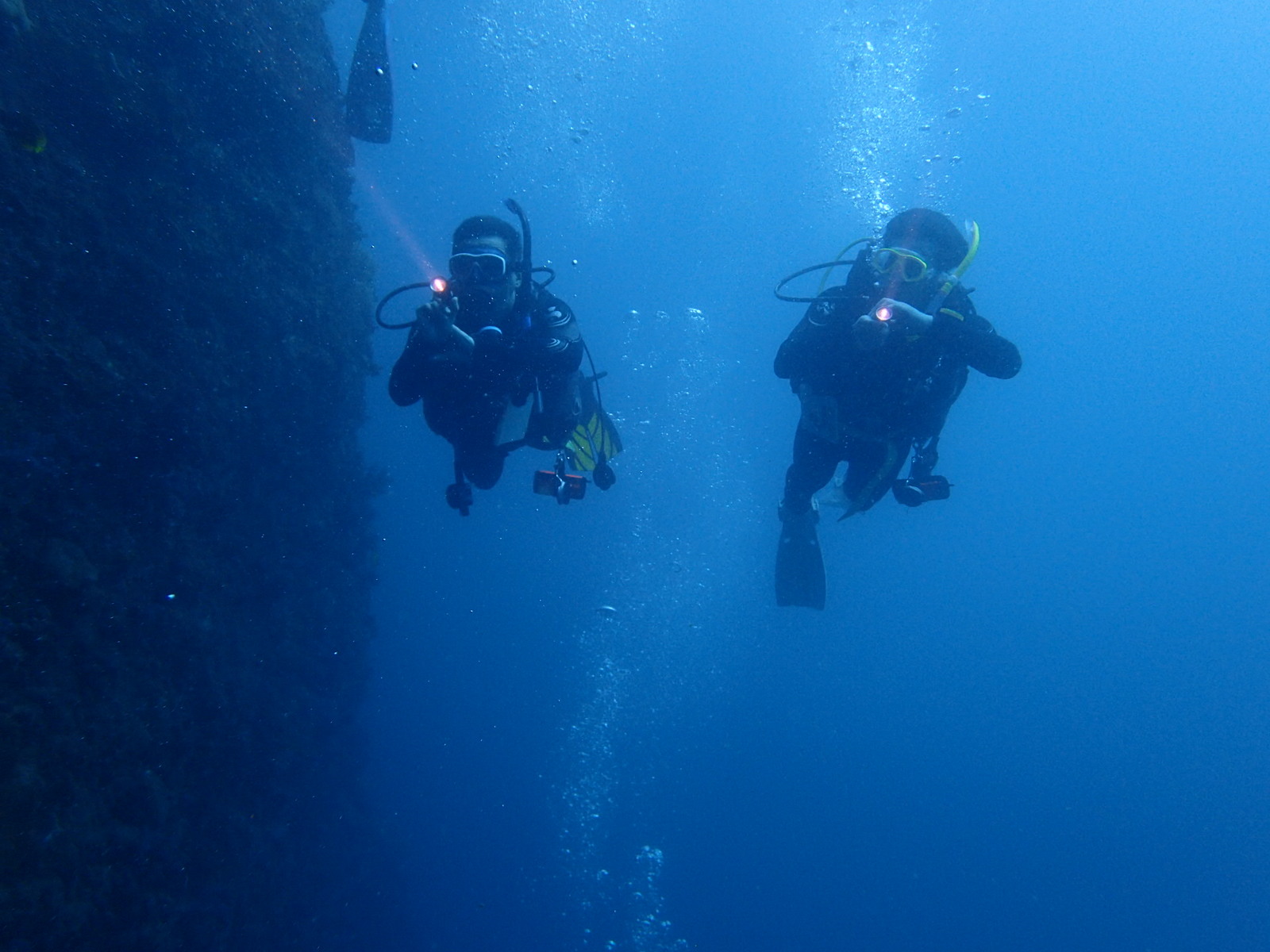 懸浮在水中,面對著深度 30 米的水中峭壁,壁面以接近垂直的角度直下水底,陽光從水面照下來,到這個深度已經有點幽暗了。但跟教練及潛伴在一起,我心中並沒有任何恐懼,只覺得平靜,專注在自己每一次的呼吸中。水裡面的聲音,是吸氣時調節器的呲呲聲,與吐氣時的氣泡聲。就這樣感受呼吸,讓自己與水融和在一起。目光看著教練,與身旁的好友潛伴。