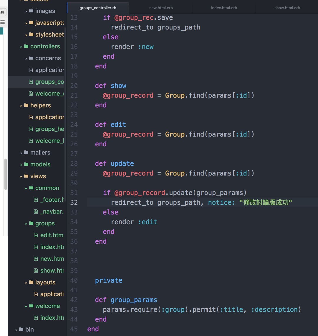 回想一個月之前,一開始按照 Rails 101 實作練習時,說實話 … 我真的看不懂啊!為什麼要寫 def index?為什麼要設 routes?什麼是 Model – view -controller?甚至連 @group.each Do |f| 以及 @groups = Group.all … 這些對我都有如天書,完全看不懂啊啊啊!(好的,我承認我程度差 XD)。但是就因為抱持著「教練帶你入門,學習是自己的責任」,我找了一堆資料狠 K,不管是 PDF、影片、教學網站 …。K 不懂再換下一份資料,就這樣一路 K 下去 … 。一直到第四堂課,才能在教室中問出夠水準的問題。