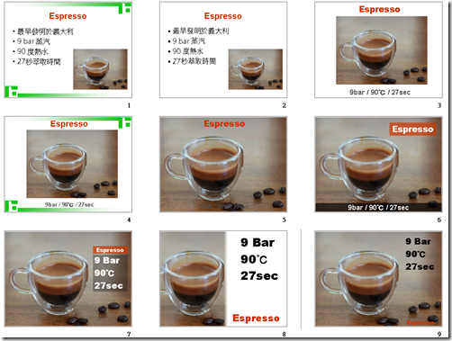 1.這是我們經常看到的投影片,有一個抬頭、一些文字、再套用底圖,圖小小的縮在旁邊