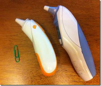 Combi 出一支兒童專用的,它的探溫頭真的是有比較小支,來量 Baby 耳溫還不錯,不會有太大伸不進去的狀況,而且測溫的速度也很快(與百靈相比)。溫度的一致性信度也蠻高的(連續測量不會有太大的偏差值)。只是測出來的溫度常比百靈低 …. 啊到底那一個比較準 … 我其實也不知道。不過看來小兒科醫生都用百靈的多。所以 Combi 這一支是當成平常量測,若懷疑有問題時,我還會用百靈再量一次。